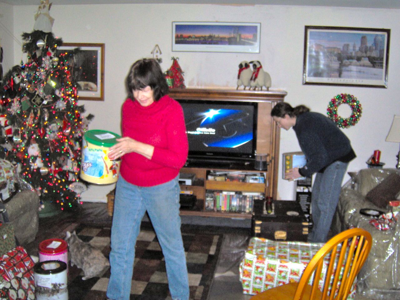 One can contained a gag gift. The Little Woman selected it and here she is opening it with a great deal of delight.